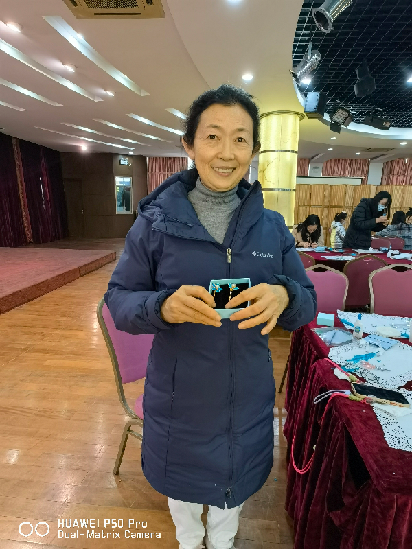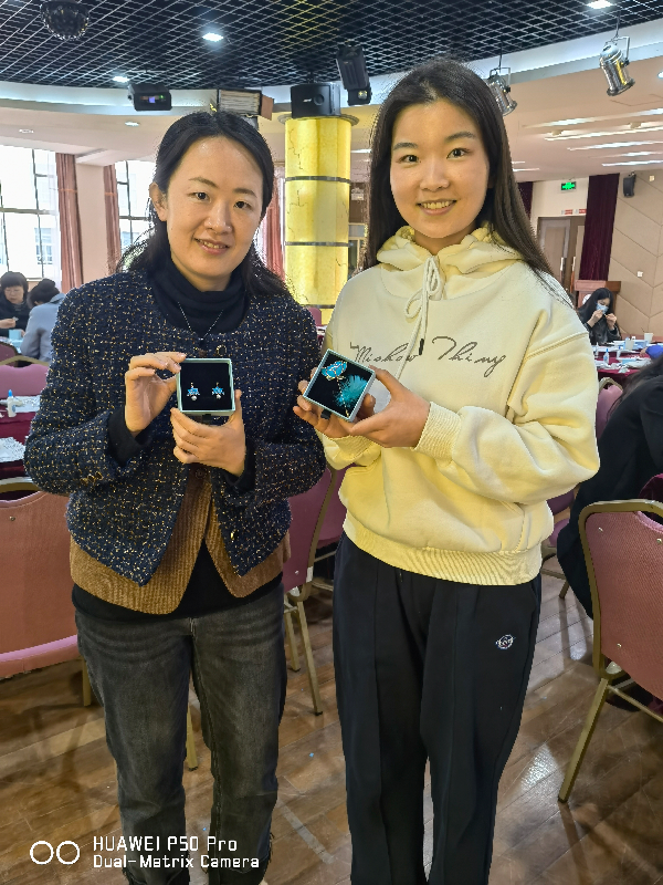 女教师们精心挑选了心仪的发钗、耳环、胸针的底座,在老师的指导下,将羽毛剪成合适的形状,根据羽毛的纹理,再小心翼翼地粘在刷了白胶的饰品底座上。慢工出细活,看似简单的步骤,实则需要耐心、细心和专注。当蓝绿色的饰品在手中渐渐完工,现场洋溢着满满的成就感和欣喜的氛围。