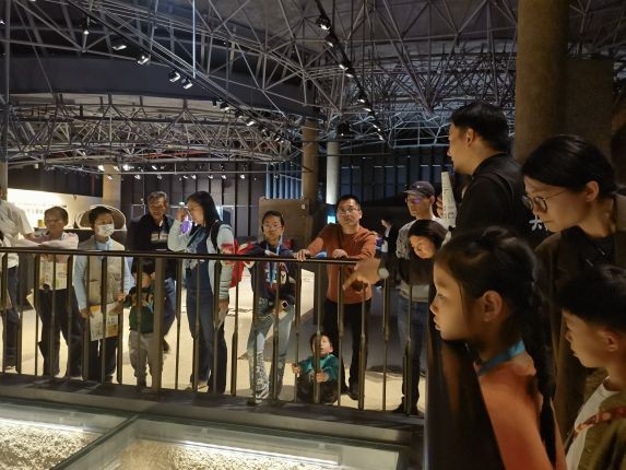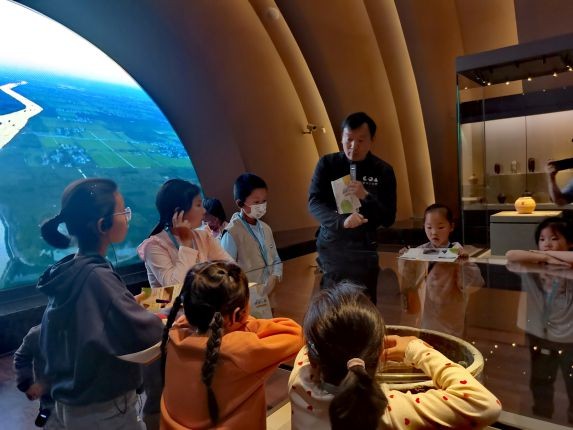 大家拿着研学手册跟着专业讲解老师的带领,步入外形像一组半出土的巨型陶罐的考古展示馆,依次探索展示馆的三大独立展厅——“文明之源”“城市之光”“历史之脉”,开启了小小考古家对广富林四千年历史的研学活动。考古展示馆里除了展示广富林遗址考古发掘的一些文物,还就地保存了一部分当年的考古现场。通过专业老师的讲解,大家更深入地了解了松江这片土地远古先民的早期生活和发展情况,对考古发掘工作有了更直观的认识,在一件件文物上看到了考古工作者们的专业修复技艺。