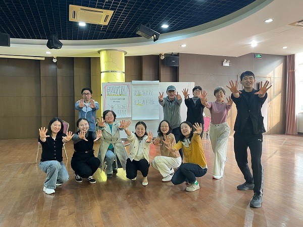 在即兴戏剧培训师的引导下,参加活动的老师们在破冰环节已沉浸在“即兴创意”带来的惊喜和欢乐之中。“即兴戏剧”活动的内核是“SAY YES”,老师们跟着培训师的示范讲解,随机两人一组,互动体验了三种不同的沟通方式:“No,because”、“Yes,but”、“Yes,and”,通过分享不同沟通方式带来的感受,大家更深体会到团队协作中彼此支持的重要性。接下来的体验环节都基于“Yes,and”的共识,分小组的“即兴故事接龙”和“拍手叫停舞台剧”,大家脑洞大开,收获了很多思维碰撞产生的创意、意外惊喜,以及团队成员间彼此的信任、接纳和协作。