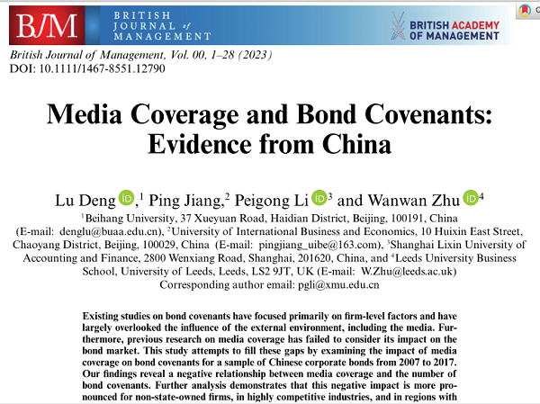 我院李培功教授以通讯作者身份与合作者撰写的文章“Media Coverage and Bond Covenants: Evidence from China”被国际权威期刊British Journal of Management接受并正式发表。论文得到国家自然科学基金的支持(批准号:72072007、72372006)