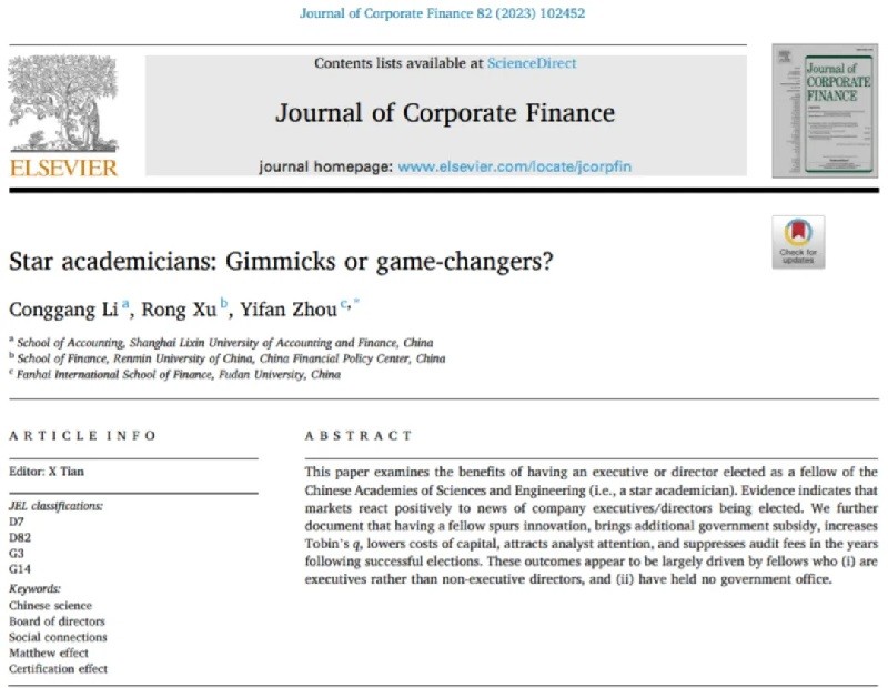 我院李从刚副教授以第一作者身份与合作者撰写的文章“Star academicians: Gimmicks or game-changers?”已被国际权威期刊Journal of Corporate Finance正式发表。《Journal of Corporate Finance》是公司财务领域公认的国际权威期刊,是JCR一区期刊和ABS四星级期刊,最新公布的影响因子为6.1。该文章的合作者包括中国人民大学财政金融学院的许荣教授和复旦大学泛海国际金融学院的周亦凡教授。