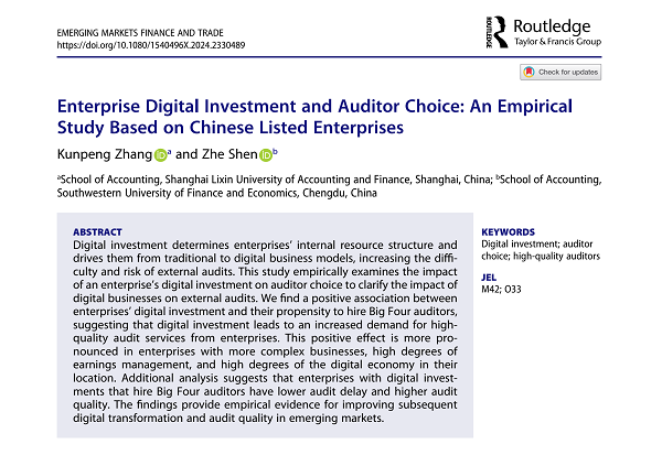 我院教师张锟澎以第一作者身份与其合作者撰写的文章“Enterprisedigitalinvestment andauditorchoice: Anempiricalstudybased on Chineselistedenterprises”被期刊Emerging Markets Finance and Trade正式发表。Emerging Markets Finance and Trade是SSCI JCR一区期刊,影响因子为4。