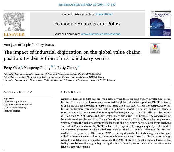 我院教师张锟澎以通讯作者身份与其合作者撰写的文章“The impact of industrial digitization on the global value chains position: Evidence from China’ s industry sectors”被期刊Economic Analysis and Policy正式发表。Economic Analysis and Policy是SSCI JCR一区期刊,影响因子为6.5。