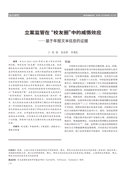 本文以2013~2019年的A股上市公司为观测对象,研究发现“校友圈”内存在公司被立案,会使圈内其他公司的年报语调下降,且这种下降在年报语调真实程度更低时更为显著。说明立案监管在校友圈中起到了威慑作用,减少了圈内公司的策略性披露,促使它们披露更为稳健、真实的信息。机制检验发现,当私有信息传递效率较高时,立案对圈内公司的威慑效果显著,当立案监管信息存在公开扩散渠道时,圈内人的信息优势会被削弱。此外,不同类别的违规有不同的威慑形式,以“年报语调下降”为表现形式的威慑效果主要存在于“误导性陈述”类案件中。校友违规受到“重处罚”的情况对圈内公司年报语调的影响更大。在经济后果检验中,我们发现校友被立案显著降低了圈内公司年报披露后一年内的股价崩盘风险。本文的研究反映出对实际监管处罚相关知识的学习有助于市场主体修正对违规成本的低估;此外,公开监管标准和规则,稳定市场主体对违规成本的预期,引导媒体对立案监管信息深度挖掘、广泛传播,将有助于在更大范围内实现立案监管的威慑效果。