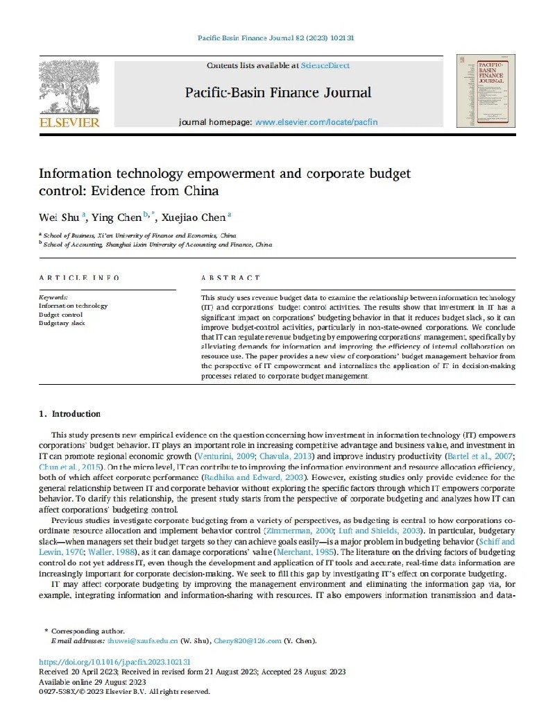 我院教师陈颖与其合作者撰写的文章“Information Technology Empowerment and Corporate Budget Control: Evidence from China”被期刊Pacific-Basin Finance Journal接受并正式发表。Pacific-Basin Finance Journal是金融学国际权威期刊,影响因子为4.6。