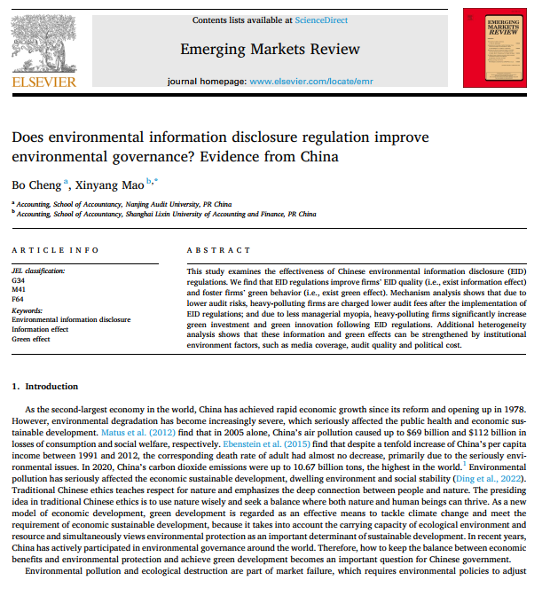我院教师毛昕旸以通讯作者身份与其合作者撰写的论文“Does environmental information disclosure regulation improve environmental governance? Evidence from China”被期刊Emerging Markets Review正式接收并发表。Emerging Markets Review是SSCI JCR一区期刊,影响因子5.6。