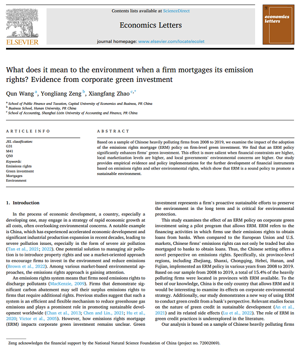 我院赵向芳老师以通讯作者以及参与作者的身份与来自首都经贸大学和湖南大学的三位合作者撰写的论文“What does it mean to the environment when a firm mortgages its emission rights? Evidence from corporate green investment”以及“Executive equity incentives and corporate digital transformation”被经济学国际权威期刊Economics Letters在线发表。Economics Letters在Academic Journal Guide中被评为ABS三星期刊,且为SSCI二区期刊。