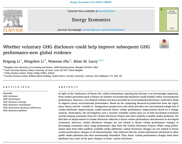365英国上市集团李培功教授以第一作者身份与来自英国和爱尔兰的三位合作者撰写的论文“Whether Voluntary GHG Disclosure Could Help Improve Subsequent GHG Performance-New Global Evidence”(《自愿温室气体信息披露是否有助于改善后续温室气体绩效--来自全球的最新证据》)被能源、环境经济学领域顶级期刊Energy Economics接受发表。