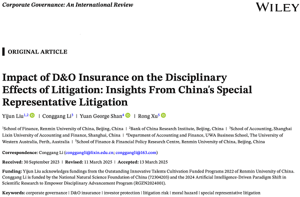 我院李从刚副教授以通讯作者身份与合作者撰写的论文“Impact of D&O Insurance on the Disciplinary Effects of Litigation: Insights from China's Special Representative Litigation”在国际期刊Corporate Governance: An International Review正式发表。Corporate Governance: An International Review是公司治理领域国际公认的权威期刊。该期刊年发文量仅42篇,投稿录用率低于5%,以其学术严谨性与创新性研究享誉全球。该期刊为ABS-3星级期刊和SSCI一区期刊,最新影响因子为4.6