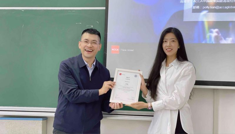 董士钧老师向来访的嘉宾表示热烈欢迎,并表示随着ACCA校外导师实践项目的顺利推进,国家化方向班学生可以定期与校外实务专家交流互动,有助于了解行业最新动态和趋势,同时也为学生提供了更广阔的职业发展机会和宝贵资源。林振兴副院长为练瑾雯女士颁发了优秀校外导师证书,表彰其多年来对学院国际化方向班人才培养所做出的卓越贡献。