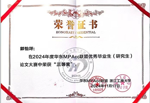 喜报|我院研究生郭怡坪获2024年华东MPAcc联盟优秀毕业生论文大赛三等奖