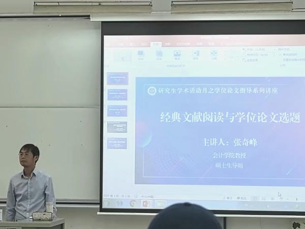 “经典文献阅读与学位论文选题”专题讲座由审计硕士导师张奇峰教授主讲。张奇峰教授以学位论文评价指标为切入点,结合了大量的研究生论文选题为同学们讲解学位论文选题重点,强调了掌握选题方法和强化文献阅读能力的重要性。他指出,研究生应结合个人兴趣与实际情况进行选题,以确保高质量完成学位论文的撰写工作。