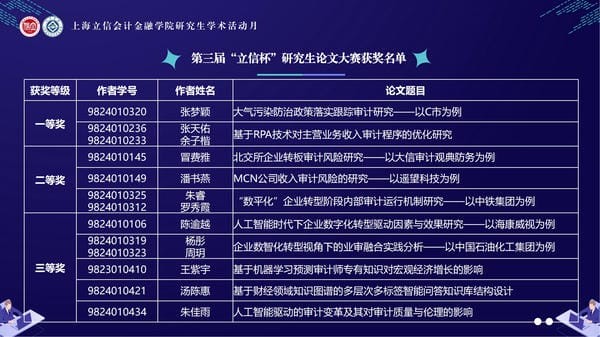 经过激烈角逐,论文《大气污染防治政策落实跟踪审计研究——以C市为例》《基于RPA技术对主营业务收入审计程序的优化研究》斩获一等奖;《北交所企业转板审计风险研究——以大信审计观典防务为例》等3篇论文荣获二等奖;《人工智能时代下企业数字化转型驱动因素与效果研究——以海康威视为例》等5篇论文荣获三等奖。
