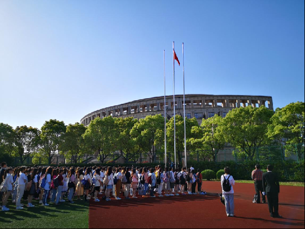 由退伍大学生组成的校国旗护卫队成员,迈着整齐有力的步伐走向升旗台。2名护旗手、1名擎旗手神情庄重地护送国旗至旗台下。伴随庄严的《中华人民共和国国歌》,五星红旗迎着朝阳冉冉升起,全体师生齐唱国歌、行注目礼。