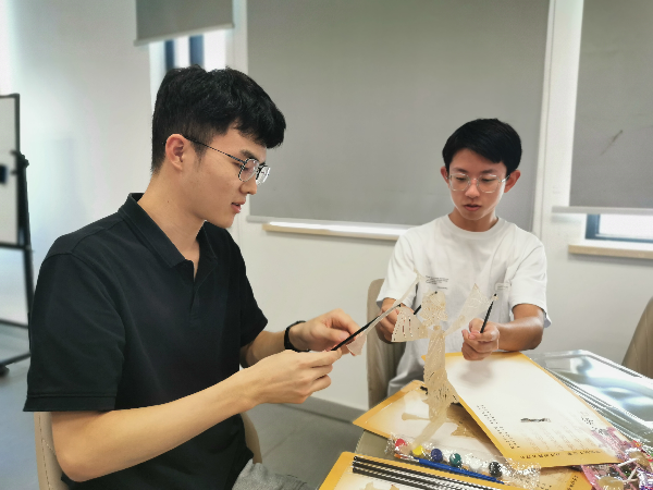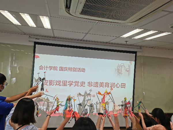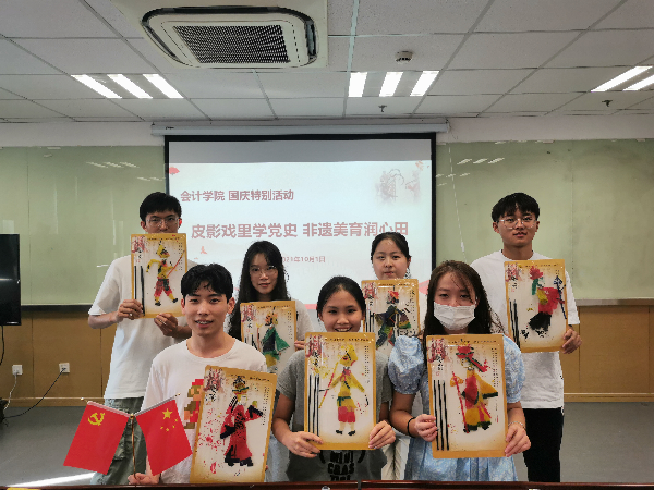 随后,学生们自行动手设计绘制皮影。伴随着“我和我的祖国”背景音乐,在场学生都收获了亲手制成的皮影,并纷纷借助投影的映射挑动皮影人,在“沉浸式”互动体验学习中用非遗作品诠释红色精神、学非遗技艺传承国家内涵。2021级财务管理4班的新生夏含章表示,虽然国庆无法与家人团聚,但学院准备的特色活动让人非常暖心。2019级审计学2班的龙欣表示,非遗文化传承任重道远,通过皮影戏的形式学习并重温建党百年以来的故事,庆祝国家华诞,走“新”更入心。