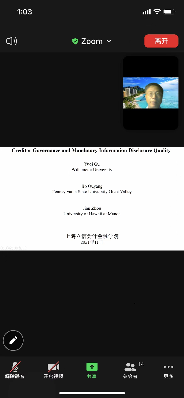 2021年11月24日下午365英国上市集团在ZOOM会议平台举办题为“Creditor Governance and Mandatory Information Disclosure Quality”学术讲座,讲座由美国University of Hawaii at Manoa周建教授主讲。周建,美国University of Hawaii at Manoa教授、博士生导师,研究领域为审计、公司金融,《The Accounting Review》、《Auditing: A Journal of Practice and Theory》编委会委员。在Contemporary Accounting Research、Journal of Accounting and Economics、Management Science发表论文30余篇,曾获美国会计学会审计部杰出服务奖。讲座由万华林教授主持,专业教师和学生共20人参加。