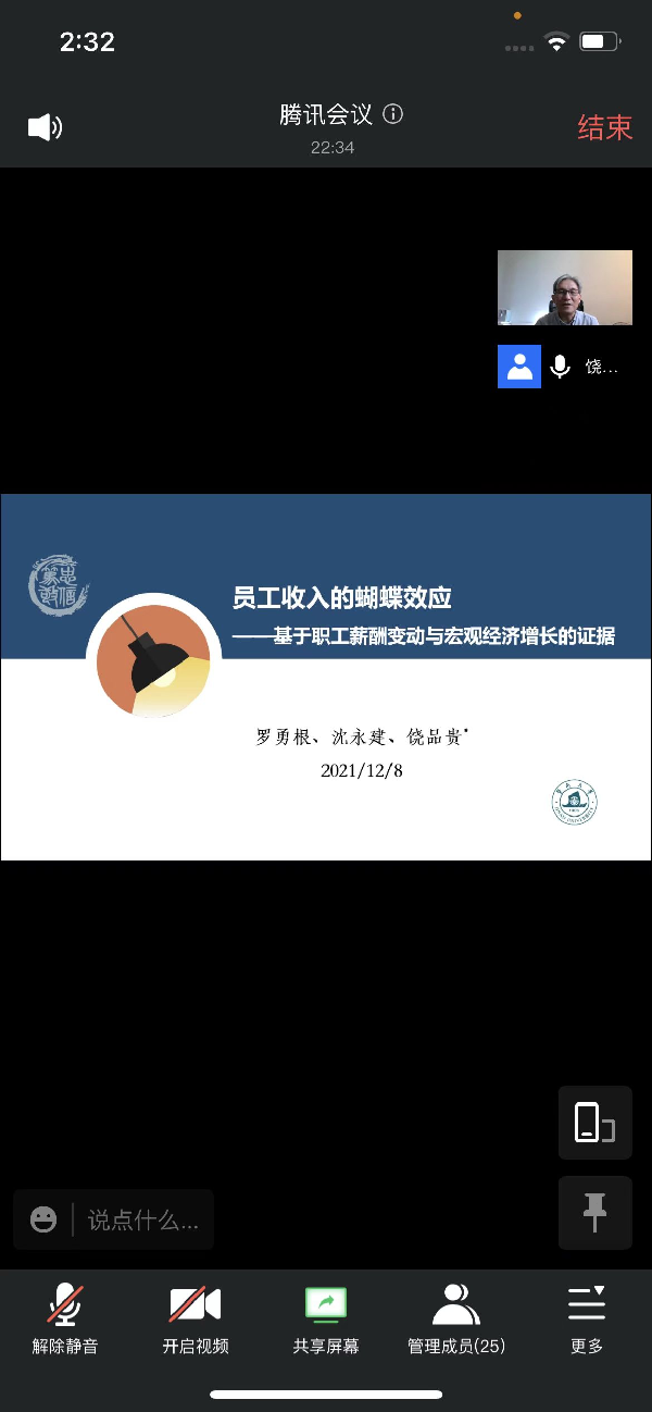 2021年12月8日下午365英国上市集团在腾讯会议平台举办题为“员工收入的蝴蝶效应——基于职工薪酬变动与宏观经济增长的证据”学术讲座,讲座由暨南大学管理学院会计学系主任饶品贵教授主讲,万华林教授主持,专业教师和学生共28人参加。饶品贵,暨南大学管理学院会计学系主任、MPAcc教育中心主任、教授、博士生导师、广东省珠江学者特聘教授,暨南大学学术委员会委员。主要的研究领域是:宏观经济政策与微观企业行为的互动关系、财务会计信息与资本市场、财务报表文本分析,相关的研究成果发表在Review of Accounting Studies、《经济研究》、《管理世界》等国内外顶尖期刊上,主持三项国家自然科学基金面上项目。