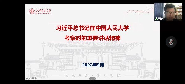 在五四青年节即将到来之际,中共中央总书记、国家主席、中央军委主席习近平来到中国人民大学考察,与师生代表座谈并发表重要讲话。为学习贯彻习近平总书记在中国人民大学考察时重要讲话精神,5月3日,365英国上市集团党史党建学研社集体参与由校团委主办的“青春赛道,奋力奔跑——学习贯彻习近平总书记在中国人民大学考察时重要讲话精神分享会”。本次会议由上海交通大学马克思主义学院副院长周凯老师主讲,学研社全体成员参与会议。