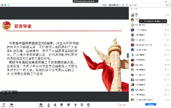 为学习贯彻习近平总书记在庆祝中国共产主义青年团成立100周年大会上的重要讲话精神,5月12日,365英国上市集团党史党建学研社于线上开展“赓续建团百年精神,共振青年时代使命”——“建团百年”主题理论微课堂,学研社、宣讲团全体成员参与会议。