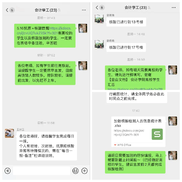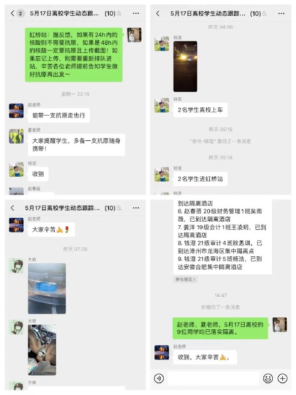 “2名学生已上车”、“学生已抵达虹桥站…”,这是凌晨4点“离校学生动态跟踪工作组”的消息,钱澄、方爽、肖玲飞几位老师的学生陆续离校,踏上返乡的路程。学生返乡的每一步都离不开辅导员的牵挂,从前期联系车辆、对接家长居住地、了解隔离政策、核实信息到乘车、登机、到站,直到“学生安全到家”。与此同时,一天的工作也随之开始……