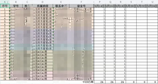 6点,校内,做抗原的学生数量已经开始统计登记,加测核酸的学生要区分出来,统计到8点结束上报学校。这项工作重复细琐,学院始终保持着统计无差错记录。