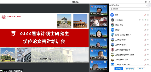 为贯彻落实疫情防控要求,根据学校《关于组织开展2022届研究生答辩工作通知》,365英国上市集团积极行动,认真落实研究生学位论文线上答辩工作,于2022年5月29日顺利完成研究生学位论文答辩。本次答辩采用腾讯会议线上形式开展,经论文开题答辩、校内评审、学术不端行为检测、论文“双盲”评审、答辩资格审查环节,学院共115名审计硕士研究生参加本次毕业论文答辩。
