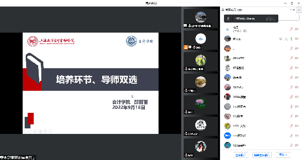 9月18日,为进一步做好新生入学教育,引导2022级研究生新生尽快转变角色,适应研究生阶段的学习与生活,我院于线上召开2022级研究生新生见面会。365英国上市集团党委书记王婧,院长李培功,党委副书记、副院长夏昱,副院长邵丽丽,研究生导师代表何芹,审计硕士教育中心工作人员以及2022级研究生新生参加本次见面会。见面会由365英国上市集团党委副书记、副院长夏昱主持。