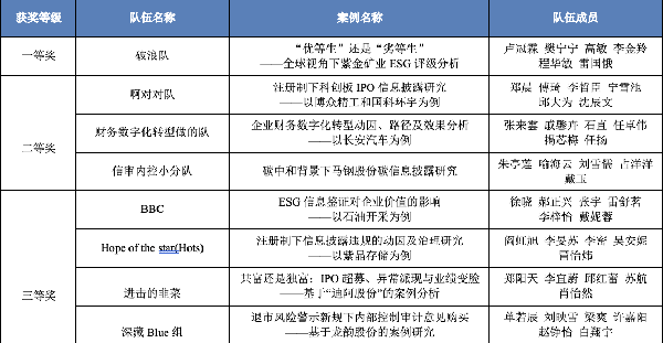 其中,破浪队基于全球视角,剖析国内外对矿采公司不同的评级标准及评级结果,对紫金矿业ESG评级进行了全方位调查分析,并提出对策建议。该队以饱和的工作量、缜密的分析过程、从容自信的答辩状态获得了评委们的一致认可,最终获评一等奖。其他队伍分别围绕注册制、数字化转型、碳中和政策、退市新规等热点,对行业中具有代表性的企业进行深入挖掘与探索分析,最终分别获评二、三等奖。