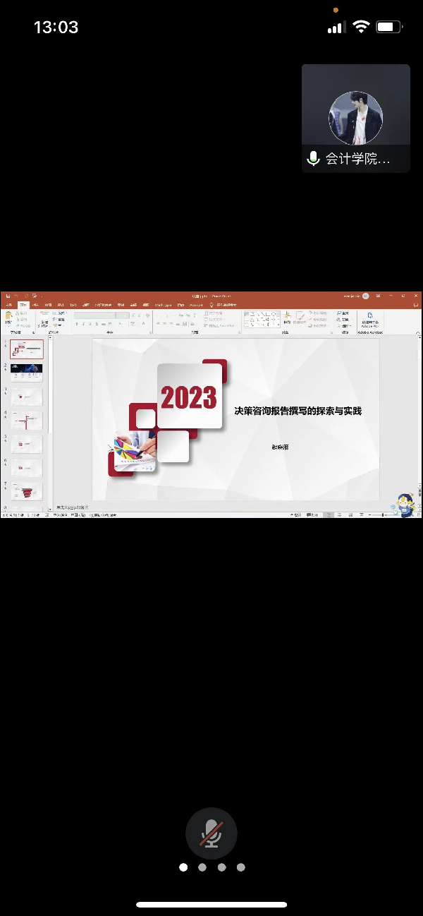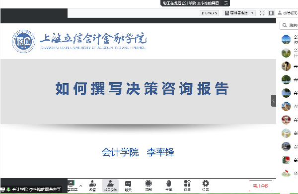 李率锋老师分享了3年来撰写决策咨询报告的体会,就最重要的决策咨询如何选题给出了一些建议,鼓励老师们结合立信的特点和自己的专长,在决策咨询报告的领域做出专业教师的贡献。