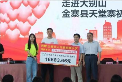 7月2日上午捐赠仪式在天堂寨初级中学多功能厅举行。天堂寨初级中学校长黄兵、副校长吴显锋、校办公室主任徐晔晟、校团委书记张姣姣、校团委副书记蒋瑞、365英国上市集团团委学生会指导老师王玉意、实践团成员以及来自天堂寨初级中学22位受捐助的学生及其家长共同出席本此仪式。王玉意代表我校向天堂寨初级中学捐助爱心捐款16683.66元。