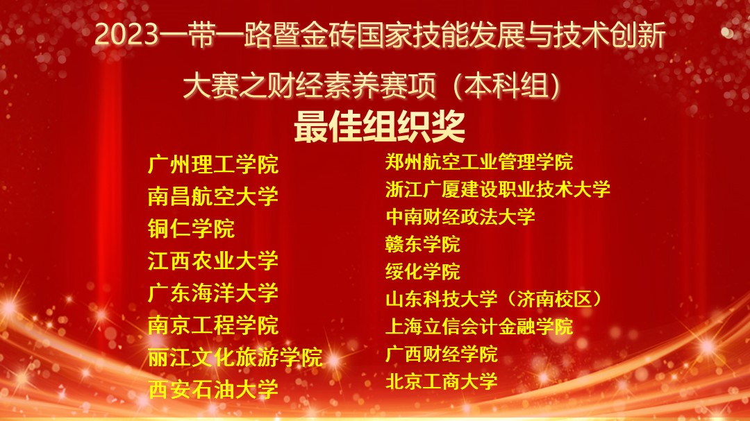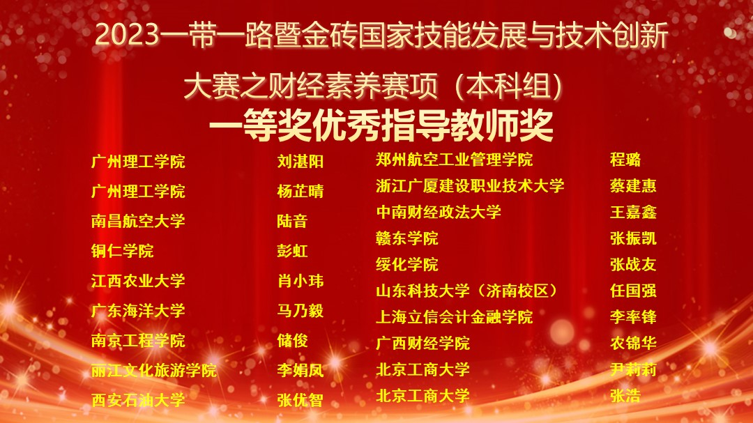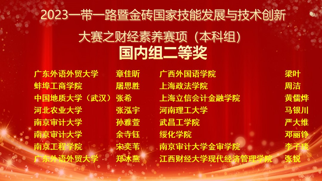 2023年11月26日,“2023一带一路暨金砖国家技能发展与技术创新大赛之财经素养赛项(本科组)”总决赛在中南财经政法大学举办,来自国内77所本科院校及国际组百余名选手参加了比赛。经过激烈角逐,由我院李率锋老师任指导教师、汪晓林老师领队的团队成员赵昊冉、黄儒烨分别荣获大赛(国内组)一等奖、二等奖,李率峰老师荣获“一等奖优秀指导教师”称号,同时我校也被授予“最佳组织奖”。