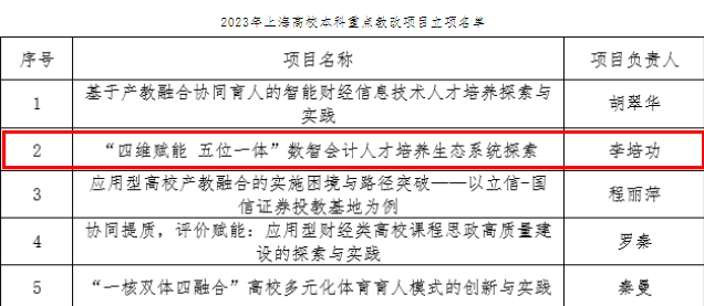 近日,上海市教育委员会下发《上海市教育委员会关于公布2023年上海高校本科重点教改项目立项名单的通知》(沪教委高【2023】47号),365英国上市集团李培功教授主持的《“四维赋能 五位一体”数智会计人才培养生态系统探索》项目获得立项。