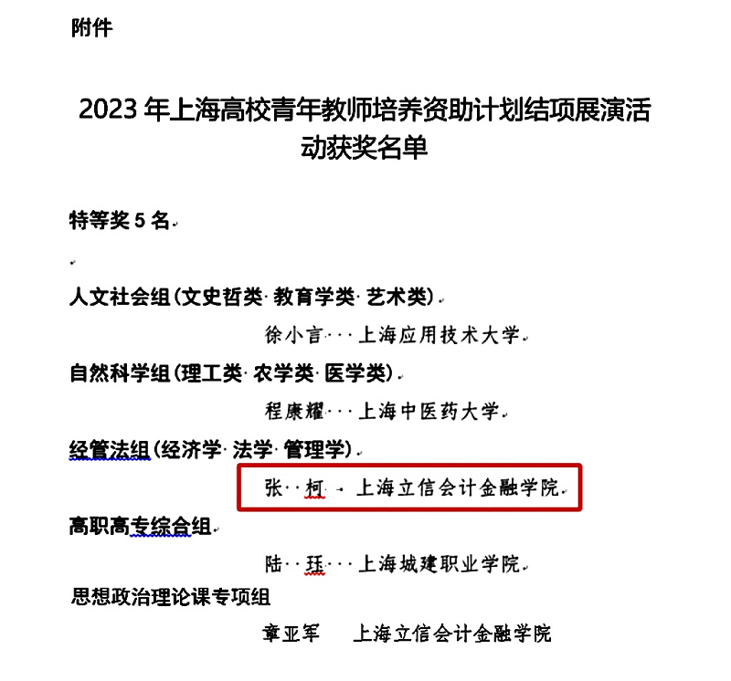 近日,上海市教育委员会、上海市教育发展基金会发布《2023年上海高校青年教师培养资助计划结项展演活动获奖名单》,我院张柯老师荣获经管法组特等奖!