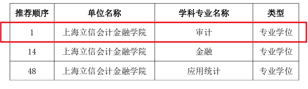 根据上海市学位办公室公示的上海市新增博士硕士学位授权审核推荐名单和排序情况,我校审计硕士获上海市拟新增硕士学位授权点推荐排序第一位。