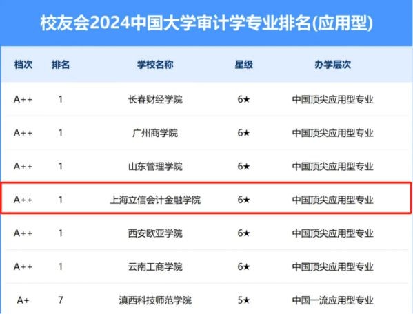 审计学专业获评六星级应用型专业(6★,A++);跻身中国顶尖应用型专业行列;位居2024中国大学审计学专业排名(应用型)首位。