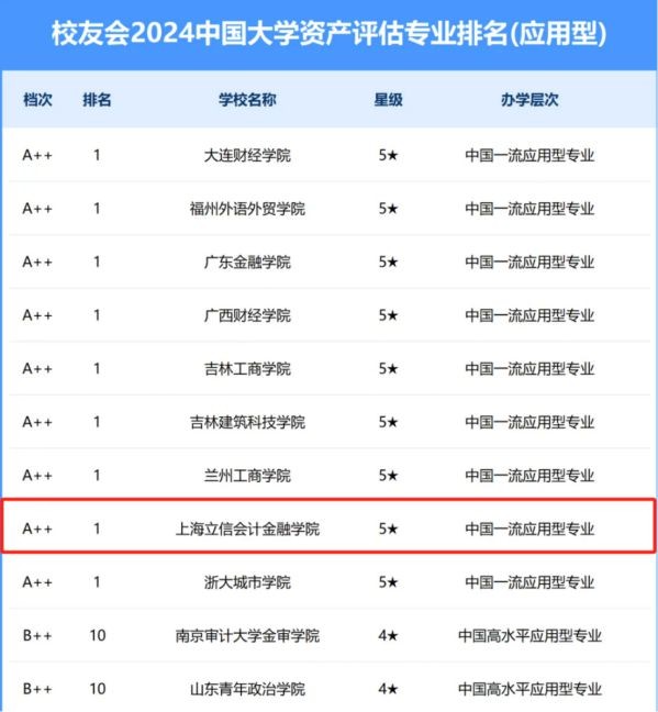 资产评估专业获评五星级应用型专业(5★,A++);入围中国一流应用型专业行列;位列校友会2024中国大学资产评估专业排名(应用型)首位。