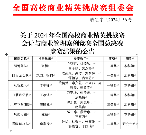 近日,2024年第十一届全国高校商业精英挑战赛会计与商业管理案例竞赛全国总决赛传来喜讯,我院六名教师带领二十八名同学组成七支队伍参赛,并全部获奖。其中,本科生组斩获三个一等奖,一个二等奖,两个三等奖,研究生组荣获二等奖。