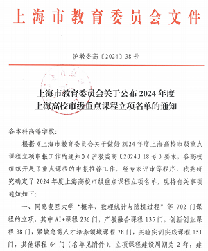 近日,上海市教委发布了《上海市教育委员会关于公布2024年度上海高校市级重点课程立项名单的通知》(沪教委高〔2024〕38号),我院推荐的3门课程获批立项。