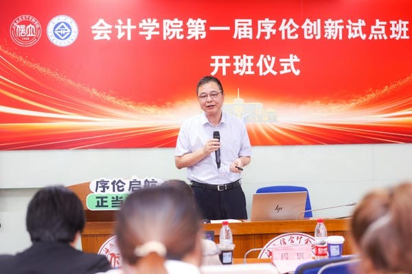 随后,周琪以立信的百年传承为主题讲授开班第一课。他从潘序伦老校长“三位一体”办学理念和立信会计师事务所发展历程出发,阐述了序伦班的设立背景、培养目标和特色路径,强调该班聚焦智能审计与数智化会计前沿,致力于打造产学研用深度融合的高水平人才培养平台。最后的提问环节,同学们围绕AI时代困惑挑战与未来职业发展踊跃提问,展现了序伦班学子直面时代变革的思考与视野。