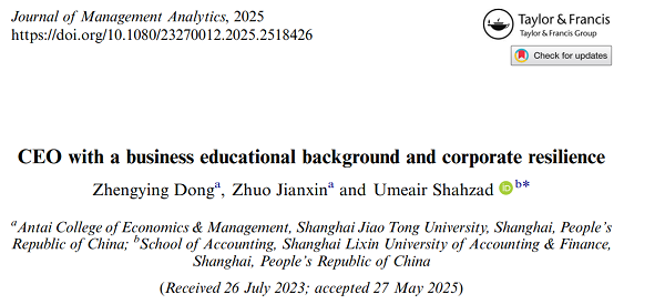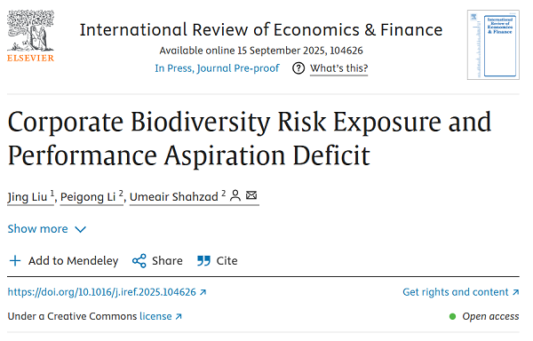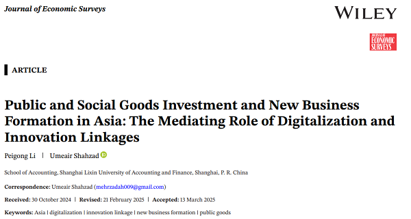 我院外籍教师Umeair Shahzad以通讯作者身份合作撰写的论文“Corporate Biodiversity Risk Exposure and Performance Aspiration Deficit”在International Review of Economics and Finance期刊发表;以通讯作者身份合作撰写的论文“Public and Social Goods Investment and New Business Formation in Asia: The Mediating Role of Digitalization and Innovation Linkages”在Journal of Economic Surveys期刊发表;以通讯作者身份合作撰写的论文“CEO with a business educational background and corporate resilience”在Journal of Management Analytics期刊发表。