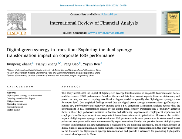 我院教师张锟澎(第一作者)与郑天宇(通讯作者)与合作者撰写的文章“Digital-green synergy in transition: Exploring the dual synergy transformation impact on corporate ESG performance”被期刊International Review of Financial Analysis正式发表。International Review of Financial Analysis是ABS-3星期刊和SSCI JCR一区期刊,最新影响因子为9.8。