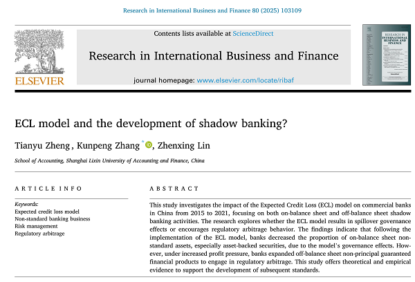 我院教师郑天宇(第一作者)、张锟澎(通讯作者)与林振兴副教授合作者撰写的文章“ECL model and the development of shadow banking?”被期刊Research in International Business and Finance正式发表。Research in International Business and Finance是SSCI JCR一区期刊,最新影响因子为6.9。