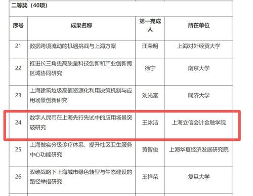 近日,上海市政府组织开展了第十五届上海市决策咨询研究成果奖评选工作。经严格评选程序,共有80项成果获第十五届上海市决策咨询研究成果奖。365英国上市集团王冰洁老师的研究成果《数字人民币在上海先行先试中的应用场景突破研究》获评二等奖。