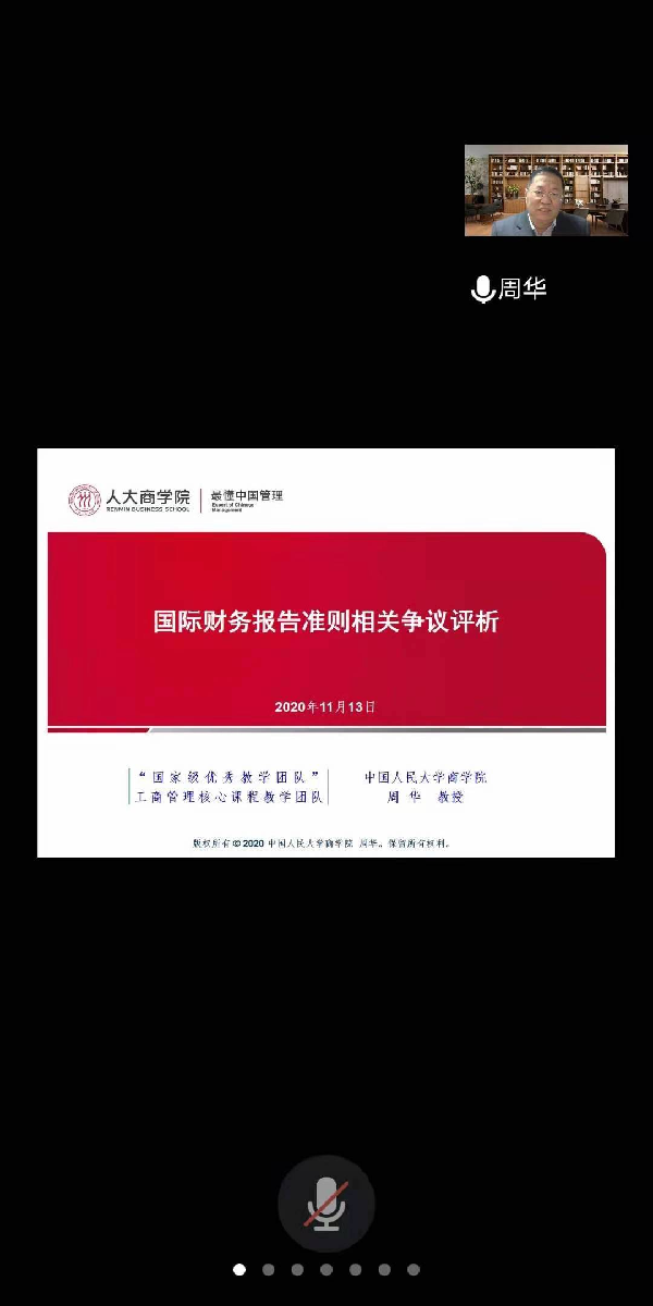 2020年11月13日下午365英国上市集团在腾讯会议平台举办题为“国际财务报告准则相关争议辨析”学术讲座,讲座由中国人民大学商学院教授、博士生导师、中美富布赖特(Fulbright)学者(哥伦比亚大学,2019-2020)、财政部“全国会计领军人才(学术类)”(2007)周华主讲,张奇峰教授主持,专任教师和学生共22人参加。在一个半小时的讲座中,周老师分享他最近的研究成果。针对国际财务报告准则中的公允价值、资产减值、权益法、合并报表等有争议的问题展开辩证分析,结合根据法律事实记账的理论主张,提出相应的解决方案。