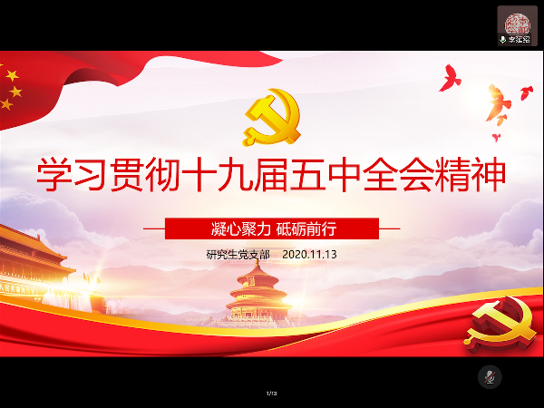 为深入学习领悟中国共产党第十九届五中全会的会议精神,进一步提升学生党员勇担当、敢作为的主人翁意识,研究生党支部于2020年11月13日举办了“凝心聚力,砥砺前行——学习贯彻十九届五中全会精神”主题党日活动。校党委委员、党委办公室主任、党委统战部部长李延绍、党支部书记周升铭、全体研究生党员参加了此次会议。
