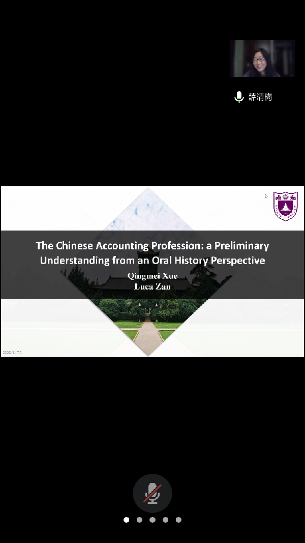 2020年12月11日下午365英国上市集团在腾讯会议平台举办题为“中国的会计人:来自口述历史的初步证据”学术讲座,讲座由南京大学薛清梅副教授主讲。薛老师曾在瑞士洛萨大学和美国伊利诺伊大学香槟分校做访问学者,多次受邀赴意大利授课。担任第一届和第二届企业会计准则咨询委员会委员。入选财政部全国会计领军人才培养计划(2007)。担任Corporate Governance, Accounting and Finance, Journal of Business Ethics, Journal of International Accounting, Auditing and Taxation, Asia Review of accounting, China Journal of Accounting Studies,《南开管理评论》、《南大商学评论》等学术期刊审稿人。讲座由张奇峰教授主持,专业教师和学生共13人参加。