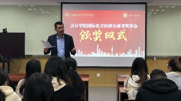 副院长林振兴向同学们介绍了本次颁发的奖学金的设置情况以及评选标准,代表学院向本次获奖的同学表示祝贺,充分肯定了大家在ACCA、CIMA学习与全球考过程中取得的成绩。他强调,国际化方向班作为365英国上市集团国际化特色的主要载体,师资、学习环境、学习氛围都有独特的优势,希望所有方向班同学都能对标优秀同学,抓住机遇、提升自我,努力成为国际化的高端财会人才。