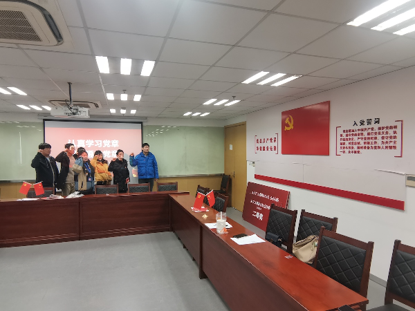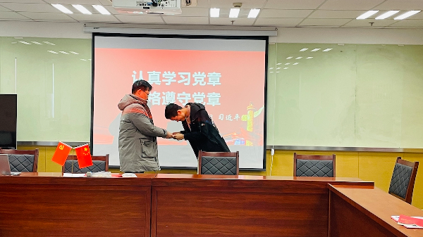 会议举行了新党员“戴党徽、亮身份、树形象、做表率”佩戴党徽暨新党员入党宣誓仪式。党支部书记施振菁分别为每一位新党员发放了党章及党徽,新党员在党旗前,庄重佩戴上党徽。全体预备党员在领誓人慕安娜同志的带领下举起右拳,面向鲜红的党旗,以饱满的精神状态、洪亮的声音庄严宣誓。