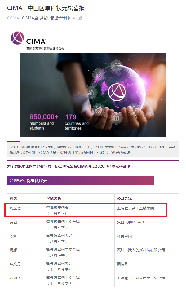 近日,接全球特许管理会计师公会(CGMA)喜报,我校365英国上市集团CIMA方向班周圣链同学在CIMA 2020年5月全球考考季中,取得中国区管理级案例考试单科状元的优异成绩。
